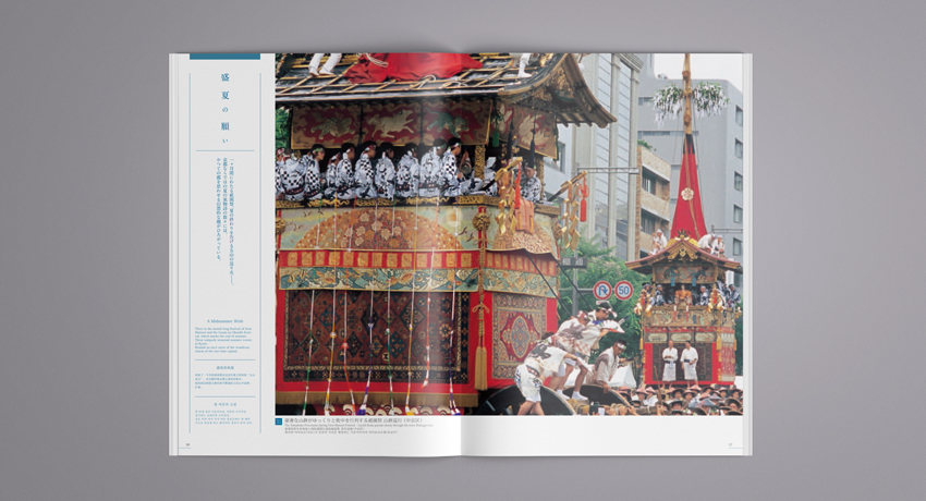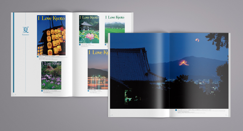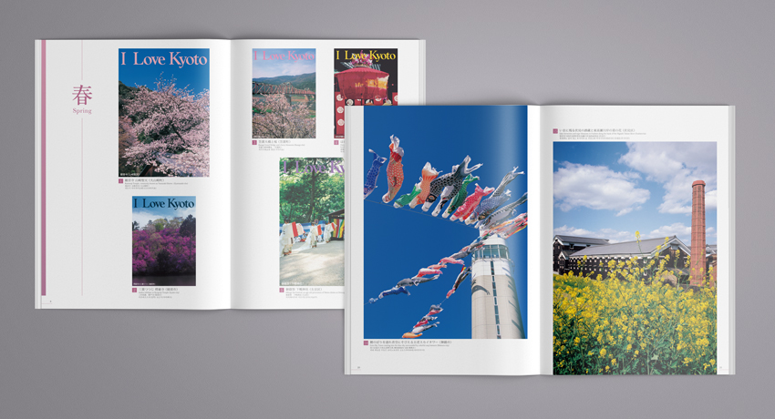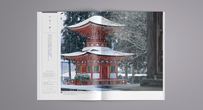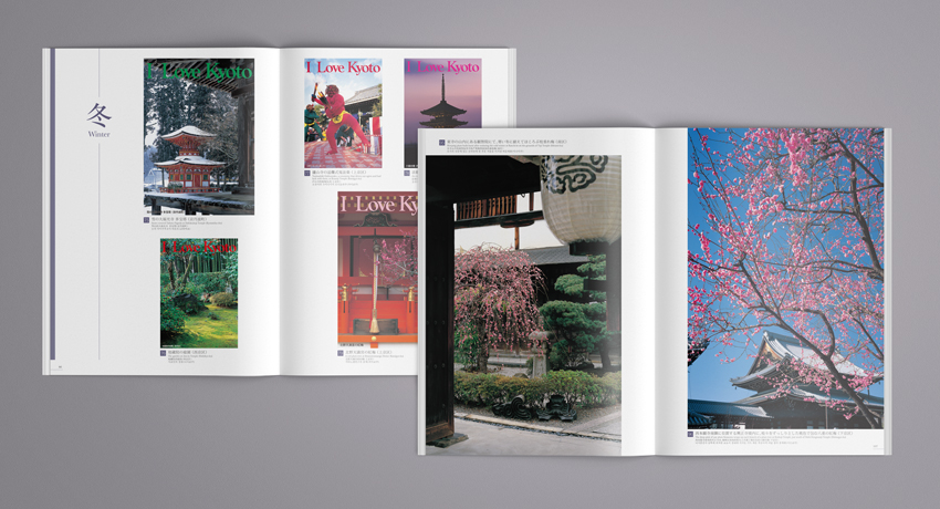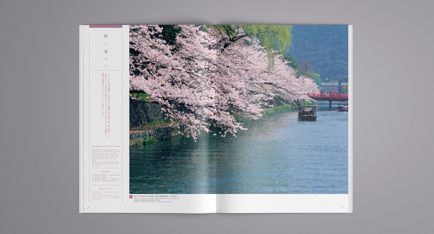 誌面内は各四季ごとにその名所の情景に対しコピーやキャプションを添え、できるかぎりシンプルなレイアウトで写真を見やすくデザインしています。