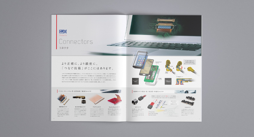 主にコネクタやセンサ等をはじめとした精密機械部品を幅広い分野で製造するメーカーの会社案内パンフレットです。