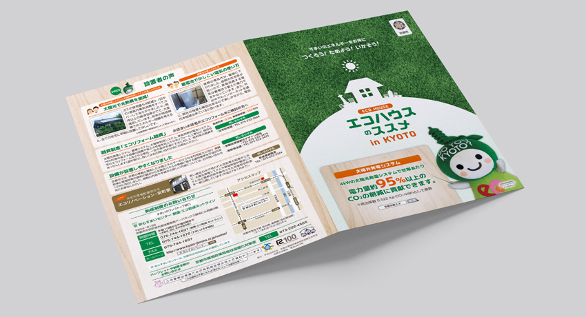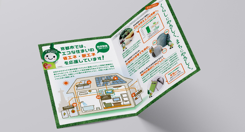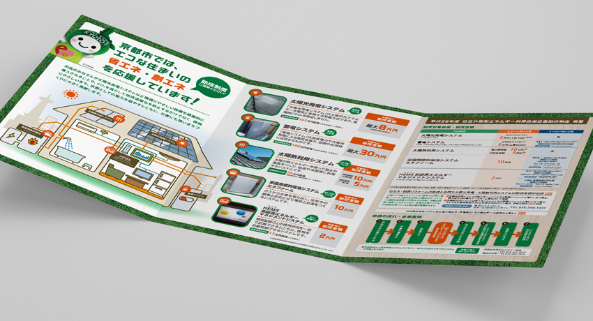 京都市の温暖化対策の訴求を目的とした、設備助成の紹介パンフレットデザインです。
