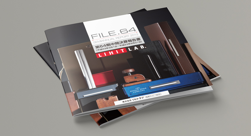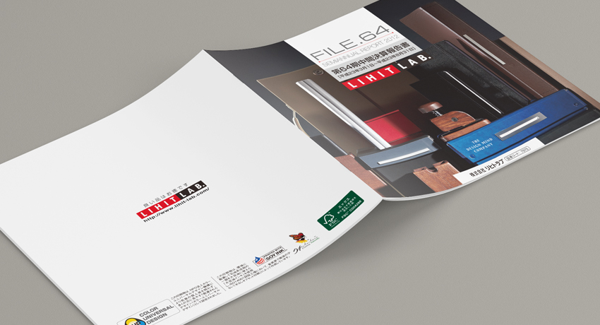 文房具メーカーの株主向けの決算報告書のカバーと見開きイントロページのデザインです。