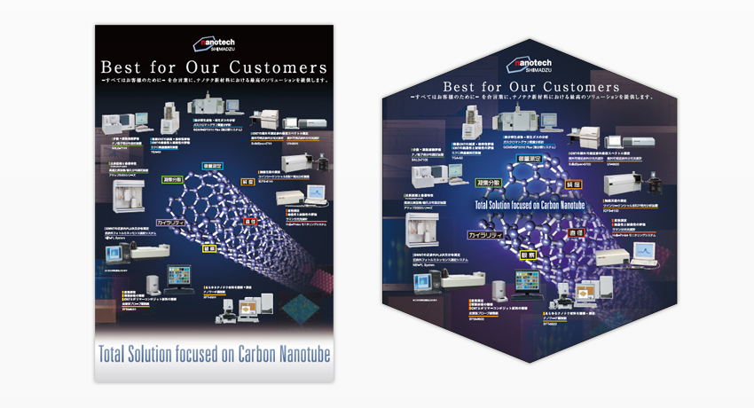 グラフィックの中心には分野を象徴する原子構造のイラストを大きく立体的に用い、その周囲をまるで宇宙空間に浮かび上がるように各製品を機能紹介と共にレイアウトしています。