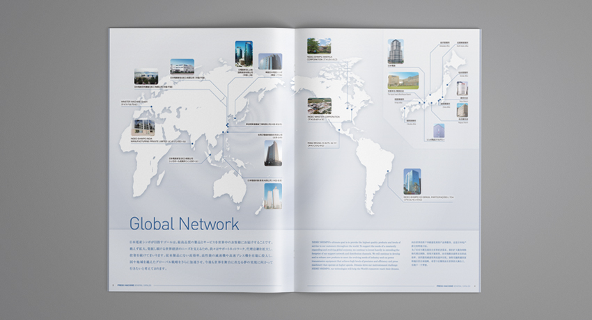 今回は表紙等のカバー、導入部の分野紹介のイメージページや、製品生産拠点の展開ページ等を基軸にデザインを部分的に担当しています。