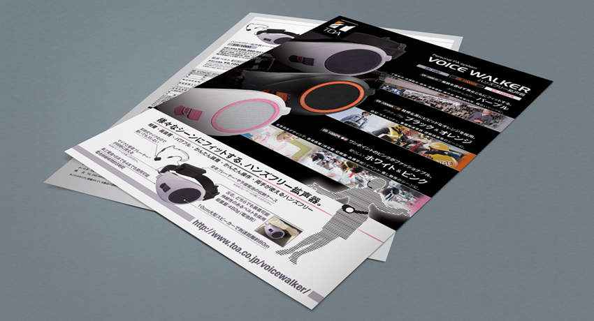 音響機器メーカーのハンズフリー拡声器のパンフレットデザインです。