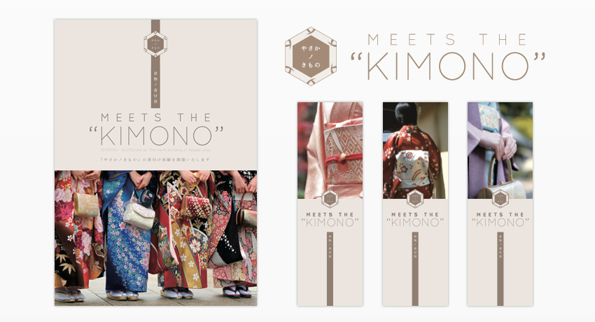 グラフィックは女性の着物姿をあえて部分部分をクローズアップしたカットで構成、着物姿の細かなディティールを印象的に見せるものにしています。